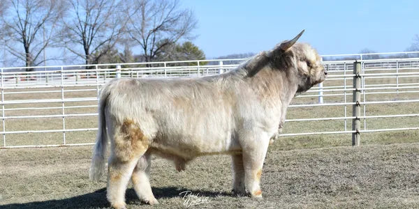 The son of Angus the 8th of Dunvegan, imported from Scotland was an extremely long bull who was a great representative of Scottish character. Genesis’ dam is Black Watch Portia, a fancy silver cow that was shown extensively, Genesis was 70 lbs. at birth, 725 lbs. at one year old, 1,145 lbs. at two years old and currently weighs 1,560 at 34 months.